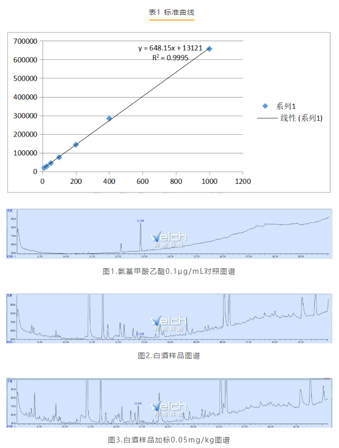 04、色譜條件 氣相色譜條件 色譜柱: WM-InoWAX,30m×0.25mm×0.25μm。 進(jìn)樣口溫度:250℃; 升溫程序:50℃,保持1min,以8℃/min升溫至180℃,再以240℃/min后運(yùn)行5min; 載氣:高純氦氣(純度>99.999%); 進(jìn)樣方式:不分流進(jìn)樣; 恒流模式:1.0mL/min; 進(jìn)樣量:1μL。 質(zhì)譜條件 電離方式:電子轟擊電離源(EI); 電離能量:70eV; 傳輸線溫度:250℃; 離子源溫度:230℃; 四極桿溫度:150℃; 監(jiān)測方式:氨基甲酸乙酯選擇監(jiān)測離子:44、62、74、89,定量離子62; 溶劑延遲:8min。 05、色譜圖或者加標(biāo)回收率結(jié)果
