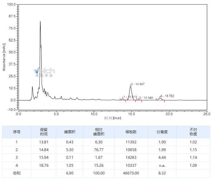 2)改變流動(dòng)相比例為甲醇:醋酸:水=75:0.3:25,柱溫30,流速1mL/min,Ultimate? LP-C18(4.6*250mm,5μm),效果圖: