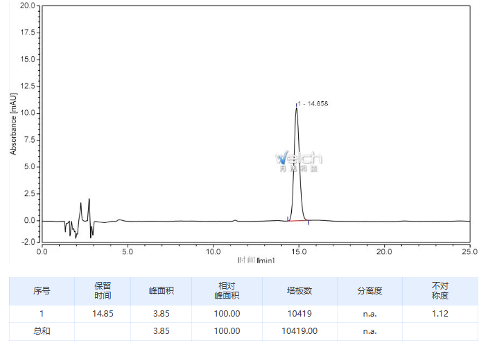 分析:此條件下分離度>1.5,雜質(zhì)距離主峰較遠(yuǎn)。 4)使用同款色譜柱重現(xiàn),效果圖: 分析:柱間分離情況及保留時(shí)間有差異。 方案二 1)使用濃度99.5%的冰醋酸,條件為:甲醇:冰醋酸:水=78:0.3:22,柱溫40,流速1mL/min,篩選更優(yōu)柱子月旭Topsil? C18(4.6*250mm, 5μm),效果圖: