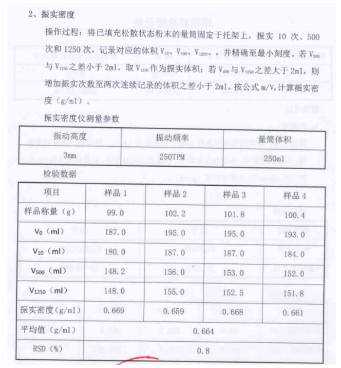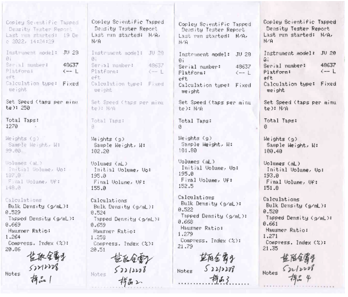 振實(shí)密度測(cè)試實(shí)拍圖 數(shù)據(jù)處理 更后,我們來看下數(shù)據(jù)處理界面,其中左側(cè)涉及樣品稱量,V0(表觀體積),Vf(V1250振實(shí)體積),右側(cè)涉及振動(dòng)次數(shù)、堆密度、振實(shí)密度、豪斯比率、壓縮指數(shù)。所有需要的參數(shù)都可以一目了然呈現(xiàn)并且打印出來。 本次試驗(yàn)一共測(cè)試了4個(gè)鹽酸金霉素樣品,堆密度平均值為0.524g/mL,RSD為0.8%;振實(shí)密度平均值為0.664g/mL,RSD為0.8%,從數(shù)據(jù)上看,重現(xiàn)性和平行性都是十分優(yōu)xiu的,怎么樣?如此優(yōu)xiu的JV 200i是否配得上優(yōu)xiu的你呢? 更后附上本次檢驗(yàn)記錄供大家參考